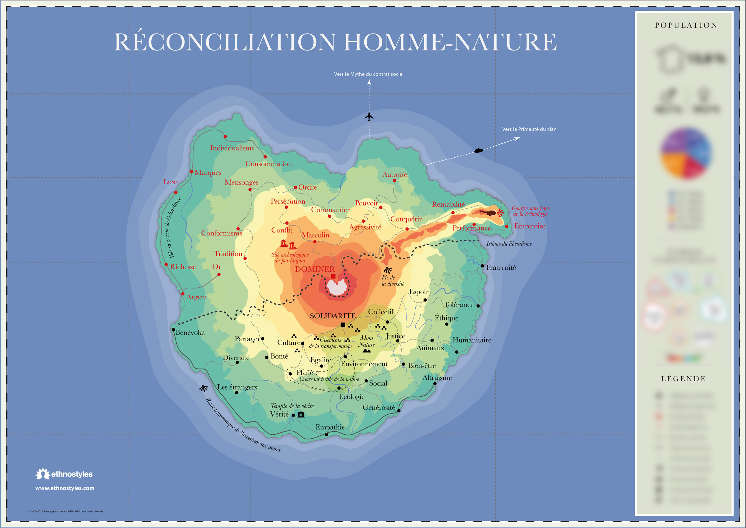 La Réconciliation de l’homme et de la nature, île-culture partagée par 13,8 % des Français, se distingue par un engagement fort, à la fois écologique, politique et social. Profondément universaliste, cette population inscrit dans son quotidien des valeurs comme la solidarité, la justice, l’environnement ou la démocratie, qu’elle concrétise par des rituels militants : commerce équitable, associations, manifestations. Les insulaires rejettent les structures traditionnelles du pouvoir, qu’ils perçoivent comme obsolètes, oppressives et violentes : autorité, ordre, religion, travail, patriarcat. Le capitalisme et la consommation de masse sont aussi sévèrement critiqués, car perçus comme des mécanismes destructeurs de la planète, des liens sociaux et du sens même de l’existence. Le modèle dominant de la réussite, fondé sur la richesse, l’ambition et la performance, est ici remplacé par un idéal d’harmonie, de sobriété et de respect du vivant. Loin des sirènes de la technologie ou du consumérisme, les habitants de cette île privilégient une vie sobre et éthique, marquée par l’écoute, la considération, l’éducation, l’intelligence collective. Leur vision du monde repose sur l’équilibre entre l’homme, la nature et la société, selon une philosophie active qui combine espoir et engagement. Refusant le fatalisme, ils valorisent la douceur, l’amour, la tendresse et l’émotion, comme autant de ressources pour nourrir un monde plus humain. L’art, la musique et la culture jouent également un rôle essentiel dans cette quête de sens et de beauté. Trois lieux symboliques cristallisent cette vision : leCroissant fertile de la Nature, espace d’espoir où l’écologie, la diversité et l’engagement œuvrent ensemble pour préserver la planète ; les Gisements de la transformation, où démocratie, égalité, liberté et citoyenneté redéfinissent une société plus juste ; et la Route panoramique de l’ouverture aux autres, où la solidarité, le respect, la fraternité et la tolérance dessinent les contours d’une humanité réconciliée. Dans cette île-culture, on