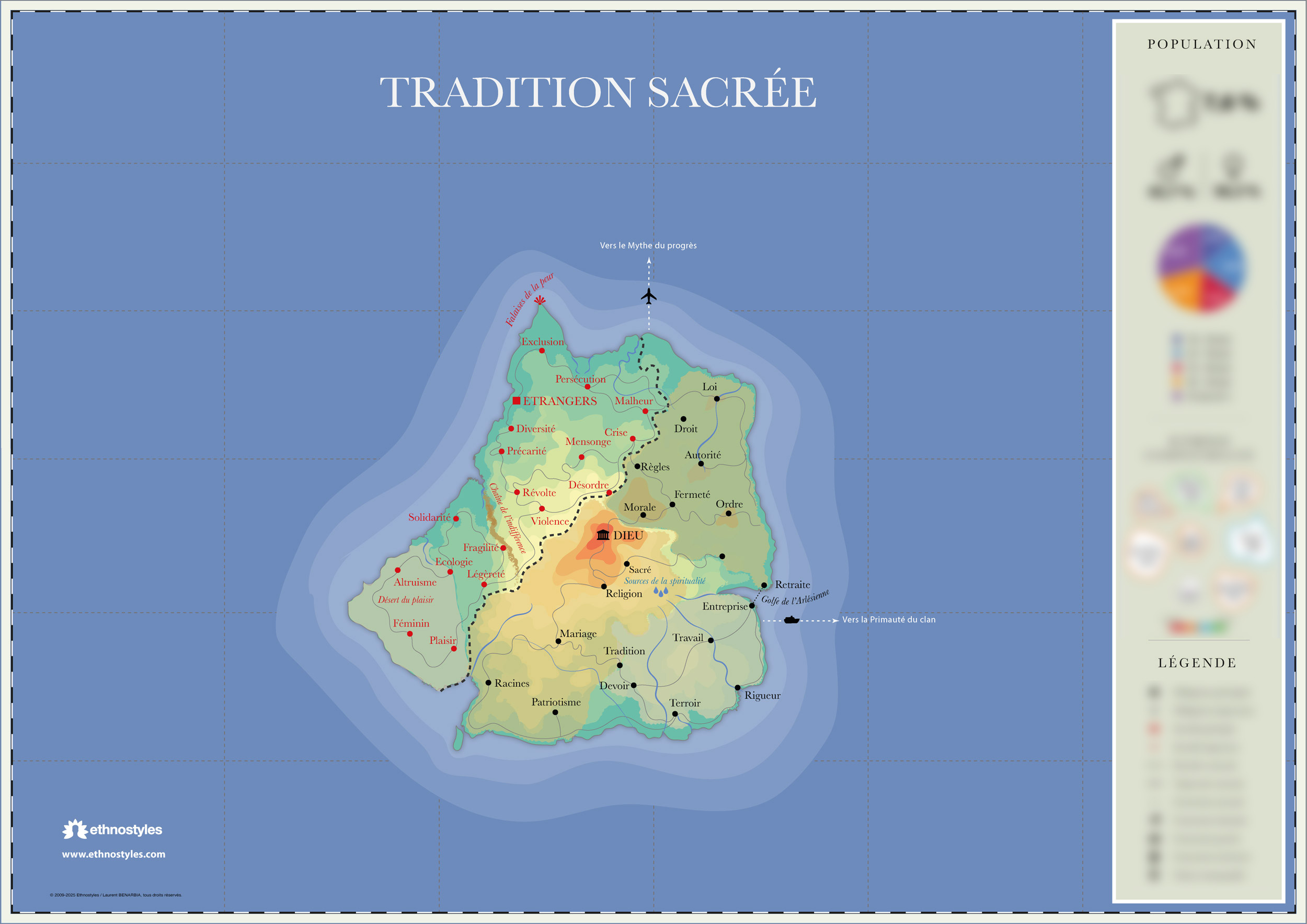 La Tradition sacrée, île-culture suivie par 7,6 % des Français, s’articule autour d’un socle religieux et moral hérité principalement du catholicisme, enrichi par des formes de spiritualité nouvelles mais toujours inscrites dans un cadre sacralisé. Pour les habitants de cette île, c’est en respectant les valeurs de la Tradition — Dieu, Loi, Religion, Devoir, Morale — que l’on échappe aux désordres d’une société moderne perçue comme déstabilisante, violente et mensongère. Cette culture croit en une France éternelle, enracinée dans son terroir, son histoire, et ses devoirs patriotiques. Le chaos moderne — incarné par l’anarchie, la révolte ou le malheur — est repoussé par l’ordre, la rigueur et l’autorité, garants d’un monde stable et structuré. Les rituels traditionnels sont centraux : voter, participer aux fêtes religieuses, fréquenter des lieux de culte. À l’inverse, les pratiques contemporaines — jeux vidéo, réseaux sociaux, musique en streaming, fast food — sont rejetées comme symptômes d’un monde en perte de repères. La fidélité à la gastronomie française, au mode de vie structuré et au rapport moral à la vie quotidienne témoigne d’un attachement profond à la continuité du passé. Cette culture ne cherche pas à transformer le monde, contrairement à d’autres îles plus progressistes, mais à le contenir, à le maîtriser, face à une modernité jugée menaçante. La Chaîne de l’indifférence marque la séparation protectrice entre les insulaires et un monde extérieur considéré comme transgressif. Deux trajectoires symboliques résument cette culture :Ordre = Morale + Autorité + Loi + Devoir + Rigueur, et Tradition = Dieu + Racines + Sacré + Religion + Terroir. Cette île-culture croit que l’Homme, en dehors de la tradition et du sacré, est livré à ses pulsions destructrices — plaisir, sexualité, violence — et que seul le respect des fondements religieux, des règles immuables et d’une hiérarchie morale peut